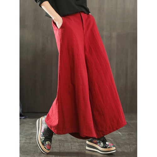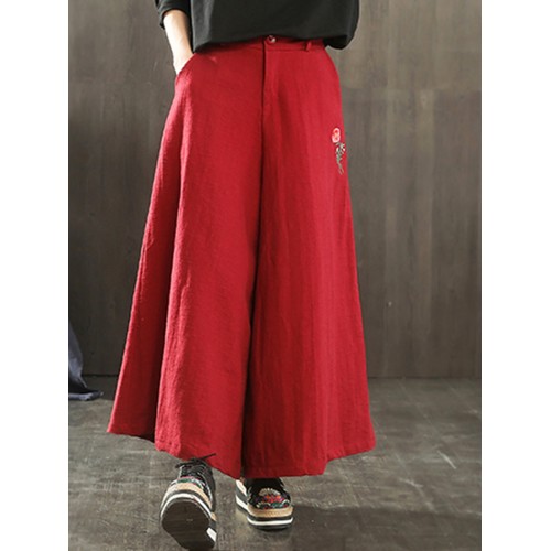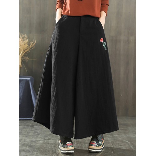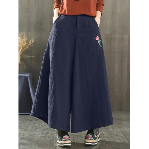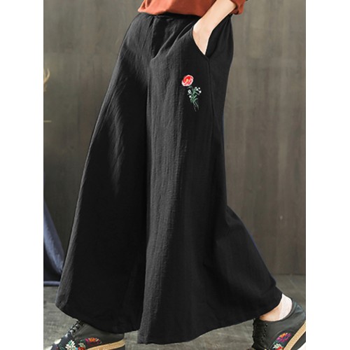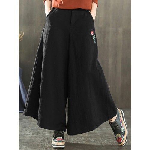 Women Wide Leg Embroidery Ninth Cotton Pants with Pocket