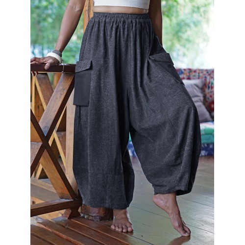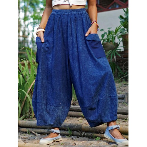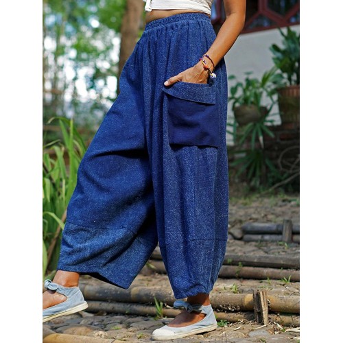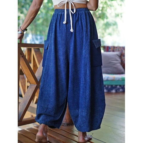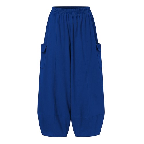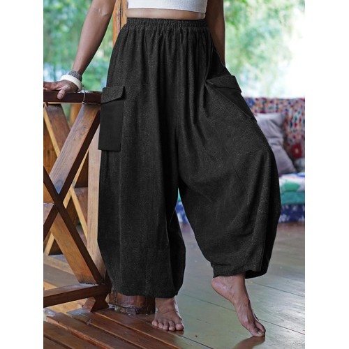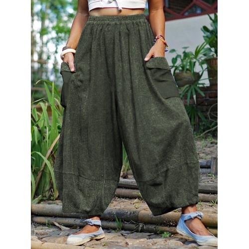 Women Cotton Solid Color Pocket Elastic Waist Harem Pants