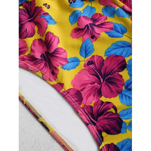 Deep Open Neckline Floral Print Backless Drawstring Swimwear