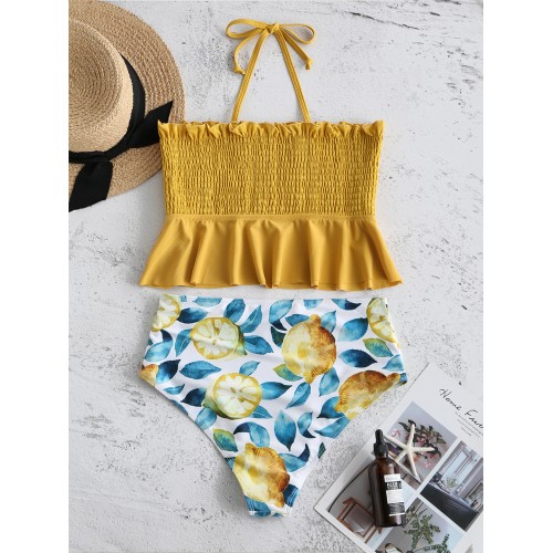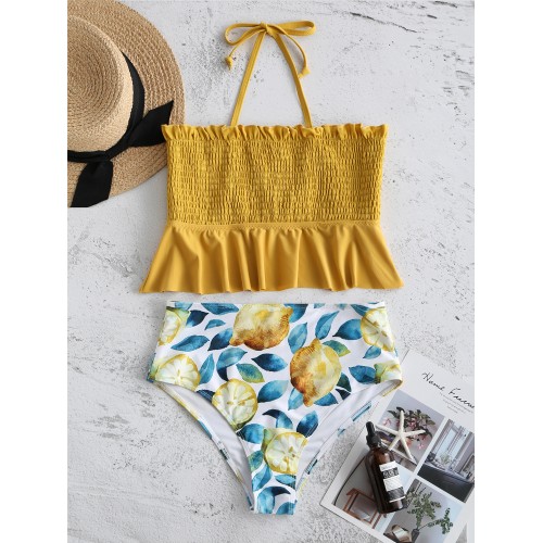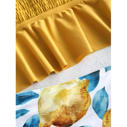 Mid Waist Strapless Ruffle Trim Flora Printed Tankinis Swimwear