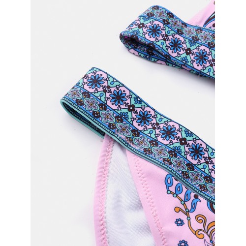 Ethnic Floral Print Knotted Halter String Summer Beach Bikini Sets